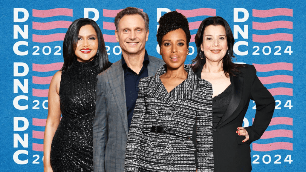 Algunas de las celebridades que participaron de la convención como anfitriones del evento son los actores Kerry Washington, Mindy Kaling, Ana Navarro y Tony Goldwyn. El entrenador de los Golden State Warriors, Steve Kerr, también brindó un discurso en apoyo a Harris.