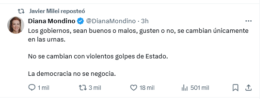 Por su parte, el presidente Javier Milei no se expresó sobre lo acontecido en el vecino país y se limitó solamente a replicar una publicación realizada por Diana Mondino, ministra de Relaciones Exteriores del gobierno nacional.