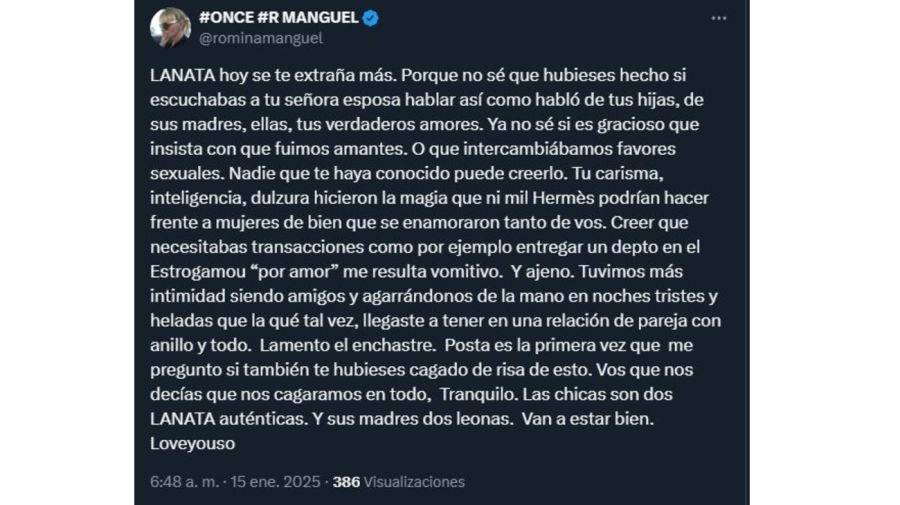 «LANATA hoy se te extraña más. Porque no sé que hubieses hecho si escuchabas a tu señora esposa hablar así como habló de tus hijas, de sus madres, ellas, tus verdaderos amores», empezó Romina Manguel en un extenso mensaje publicado en su cuenta de X (ex Twitter).