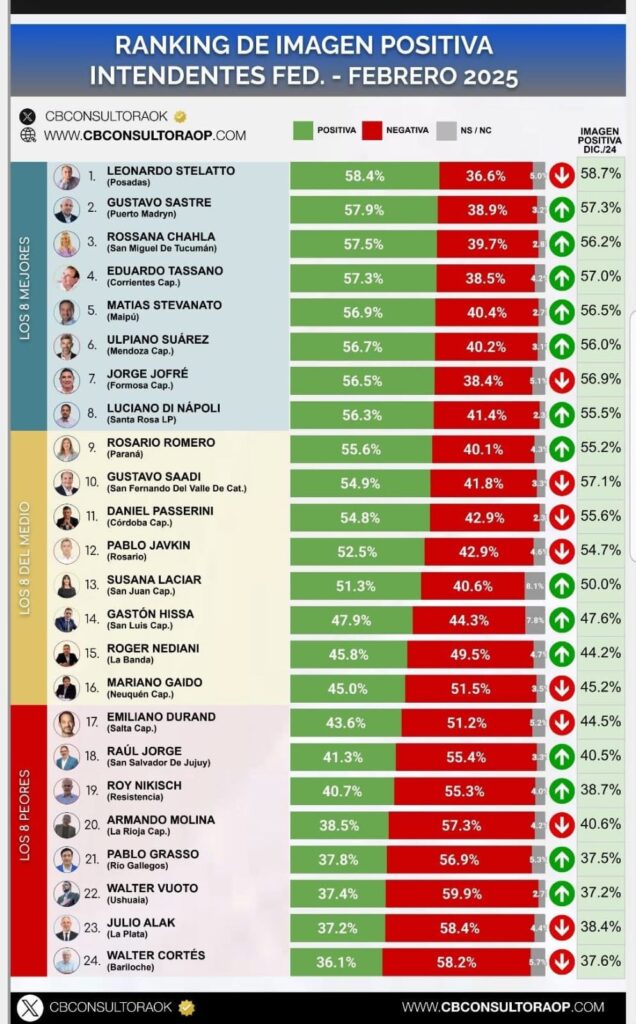 En el caso de Chahla, la medición arroja un 57,5% de imagen positiva y un 39,7% de negativa, consolidándose como una de las figuras políticas con mayor respaldo ciudadano.