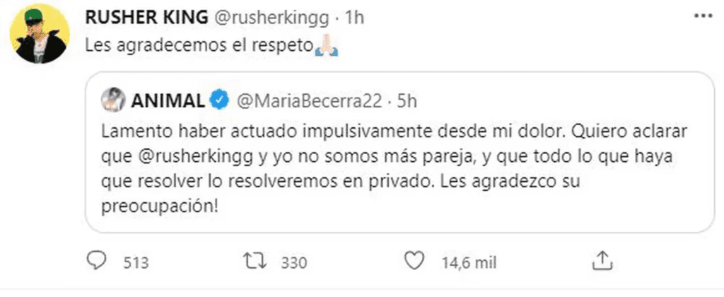 “Nosotros terminamos muy mal la relación, pero son cosas de wachines e inmaduros”, reflexionó Rusherking esta semana en el programa de Grego Rosello. En aquel momento, los tuits de María no apuntaban a alguien en particular, pero para sus admiradores había quedado más que claro que la furia estaba dirigida hacia su novio.