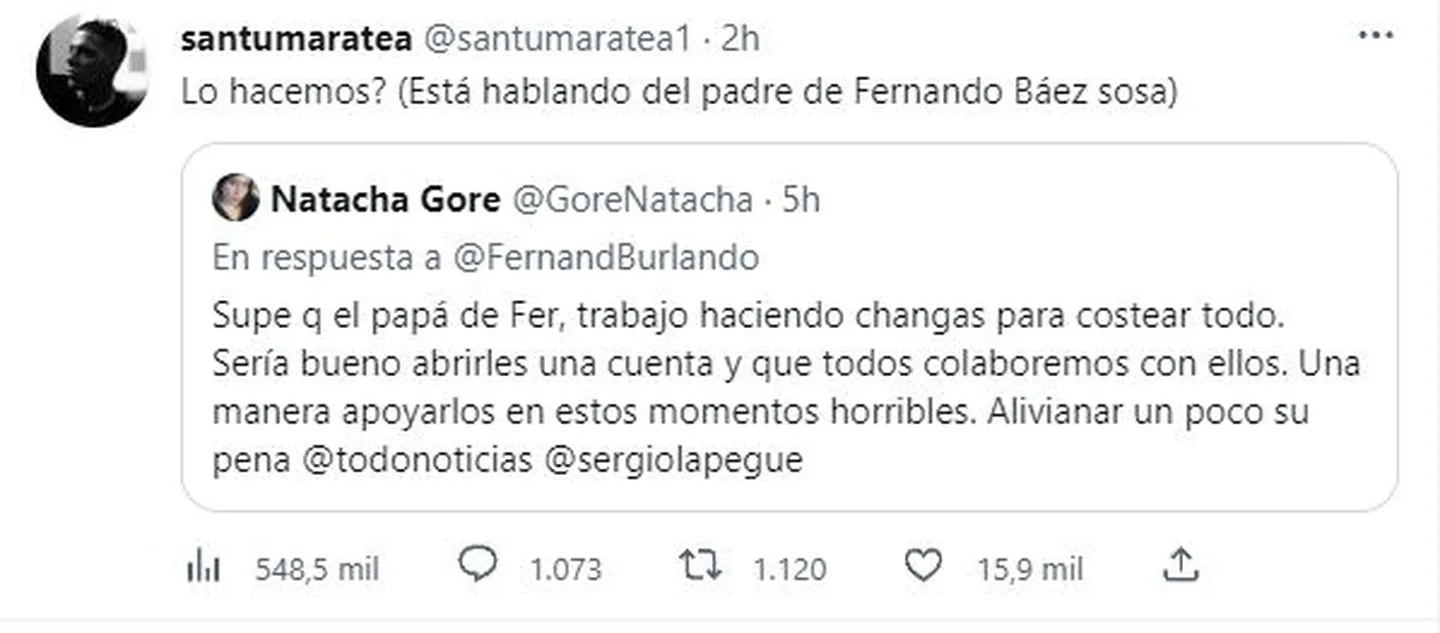 Todo ocurrió después de que una usuaria llamada Natacha Gore comentara que Silvino trabajó haciendo changas para costear los gastos de su estadía en Dolores. “Sería bueno abrirles una cuenta y que todos colaboremos con ellos. Una manera de apoyarlos en estos momentos horribles. Alivianar un poco su pena”, escribió a modo de iniciativa.