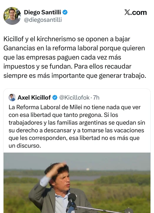 «Kicillof y el kirchnerismo se oponen a bajar Ganancias en la reforma laboral porque quieren que las empresas paguen cada vez más impuestos y se fundan. Para ellos recaudar siempre es más importante que generar trabajo», se quejó el funcionario en su cuenta de X, constató la Agencia Noticias Argentinas.