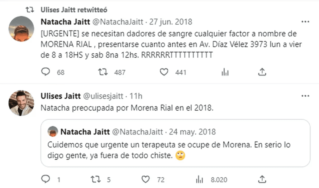 A su vez, el hermano de la fallecida modelo recordó tweets de ese mismo año donde Natacha pedía ayuda para Morena Rial. “Cuidemos que urgente un terapeuta se ocupe de Morena. En serio lo digo gente, ya fuera de todo chiste”, se lee en uno de los tweets. Mientras que en otro la mediática compartía información para que pudieran donar sangre para la joven.