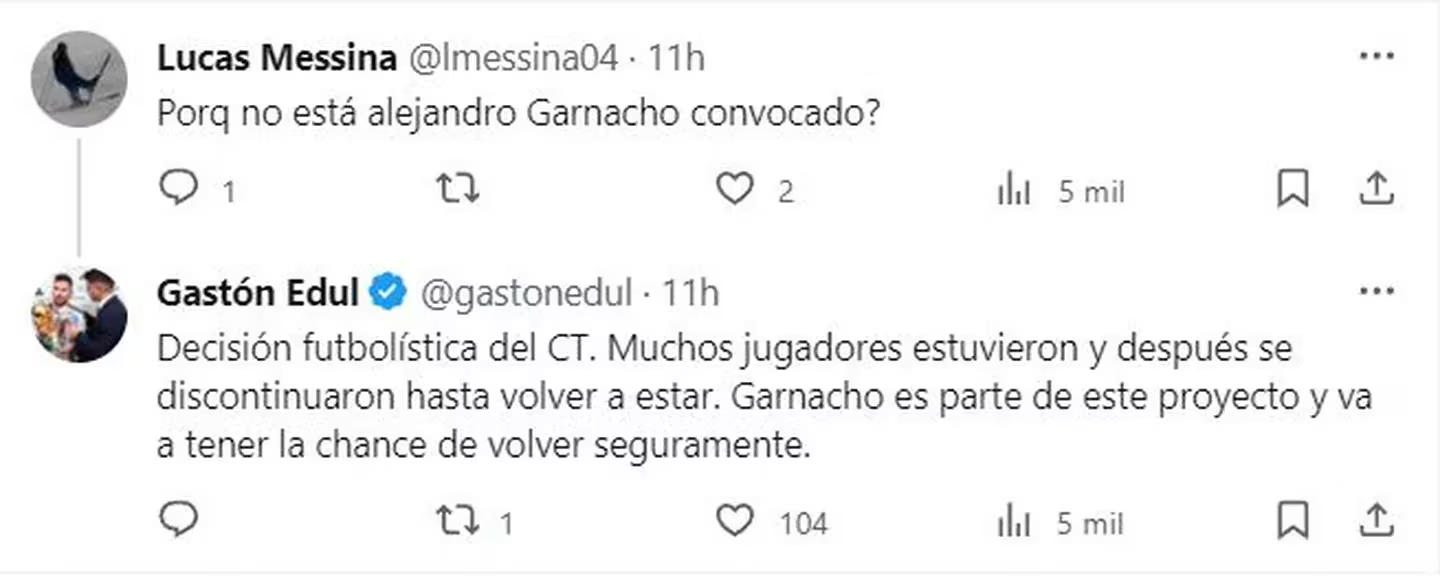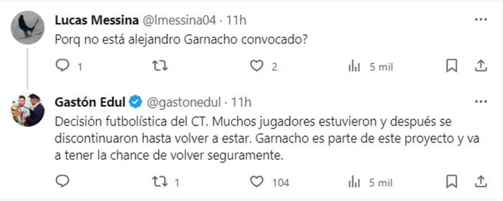 El encargado de despejar todo tipo de dudas fue el periodista Gastón Edul. “Decisión futbolística del cuerpo técnico. Muchos jugadores estuvieron y después se discontinuaron hasta volver a estar. Garnacho es parte de este proyecto y va a tener la chance de volver seguramente”, sentenció.