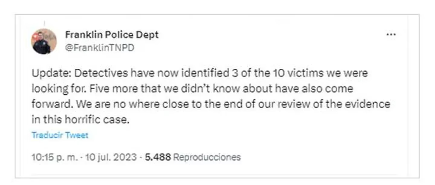 En tanto, la policía local, quien publicó en sus redes sociales una foto del detenido, informó que tres de las diez víctimas fueron identificadas. “Cinco chicos más, de los que no sabíamos, se han presentado en la comisaría. No estamos cerca del final de nuestra revisión de la evidencia en este horrible caso”, señalaron a través de un tuit.