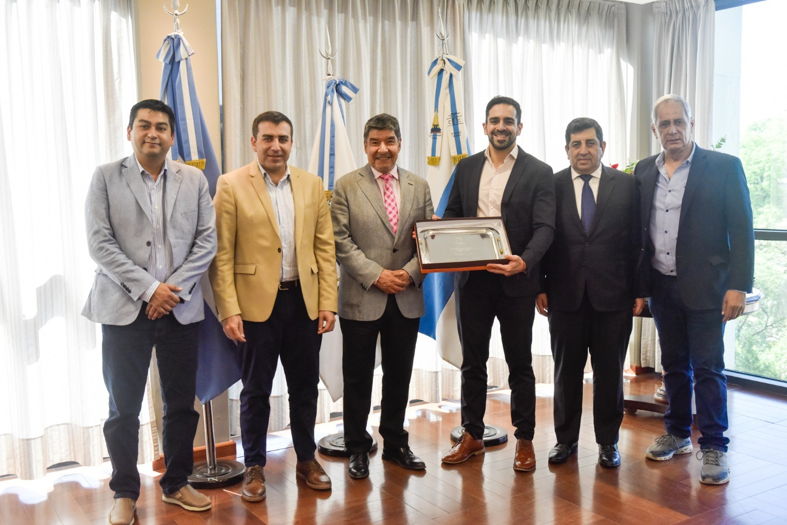 Previo a la charla, el vicegobernador a cargo del Poder Ejecutivo, Miguel Acevedo, recibió en su despacho al directivo de la Fundación Federalismo y Libertad, José Godoy, a quien le hizo entrega en nombre de la Legislatura de una bandeja por promover los valores de una sociedad libre y democrática.