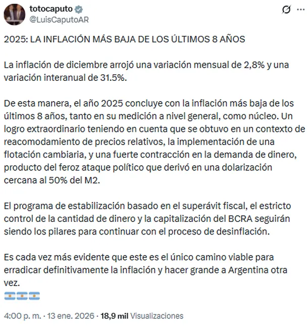 En redes sociales, el ministro de Economía destacó que la inflación de 2025 es «la más baja de los últimos 8 años».