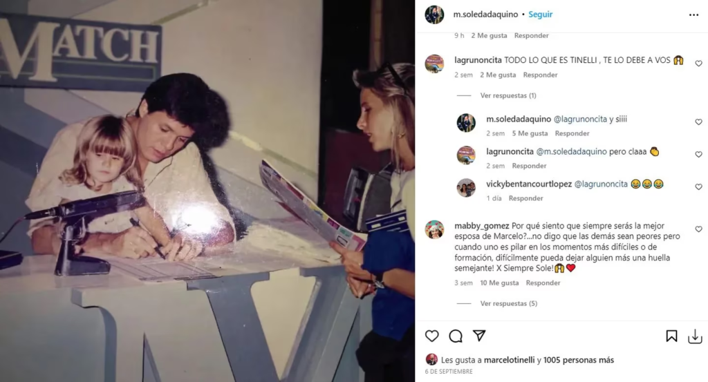 El 6 de septiembre, la exmodelo publicó una foto retro donde se lo ve al exconductor de VideoMatch con Micaela a upa y ella a un costado, con una revista en la mano, en un estudio de TV. “Que bellos recuerdos. Yo firme con mis bebés acompañando el crecimiento”, sostuvo, y no dudó en responder un mensaje en el que le decían que el presentador es quien es gracias a ella: “Todo te lo debe a vos”. Convencida de las palabras de su seguidora, afirmó: “Y siii”.