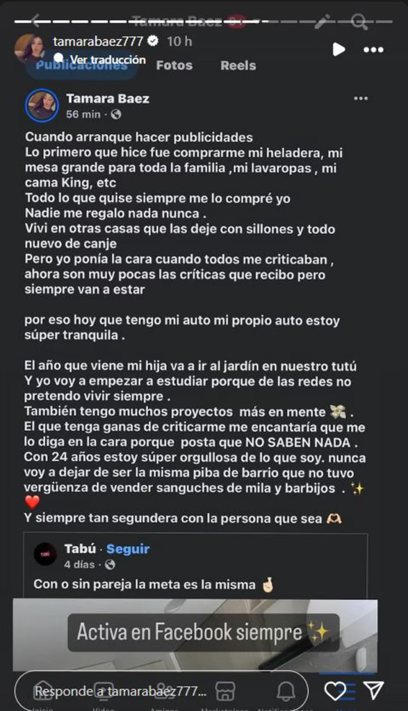 Además, especificó que tiene “muchos proyectos en mente”, aunque no aclaró cuáles. “El que tenga ganas de criticarme me encantaría que me lo diga en la cara porque posta que NO SABEN NADA. Con 24 años estoy súper orgullosa de lo que soy. Nunca voy a dejar de ser la misma piba de barrio que no tuvo vergüenza de vender sándwiches de mila y barbijos. Y siempre tan segundera con la persona que sea. Con o sin pareja la meta es la misma”, cerró.