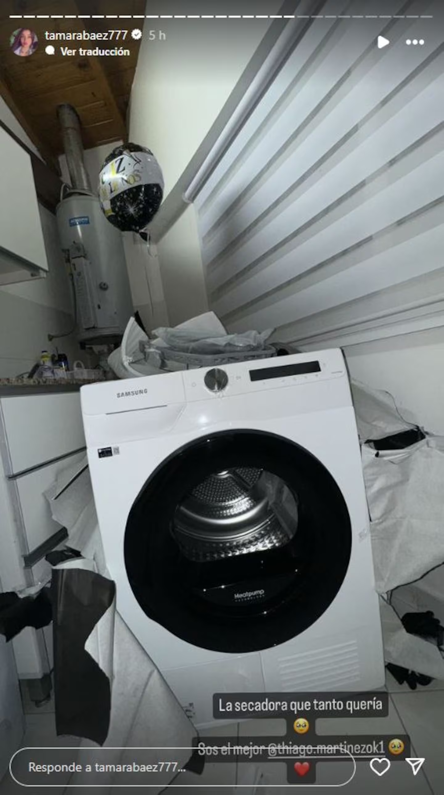 “La secadora que tanto quería. Sos el mejor”, escribió Tamara en la historia en la que mostró el electrodoméstico. Luego, hizo un video con el secarropa en funcionamiento. “Es el mejor regalo que me pudo hacer. Les juro”, escribió.