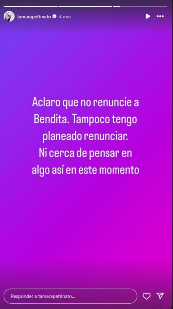 Para poner fin a los trascendidos, la periodista rompió el silencio en sus redes. “Aclaro que no renuncié a ‘Bendita’. Tampoco tengo planeado renunciar. Ni cerca de pensar en algo así en este momento”, escribió en una historia de Instagram.