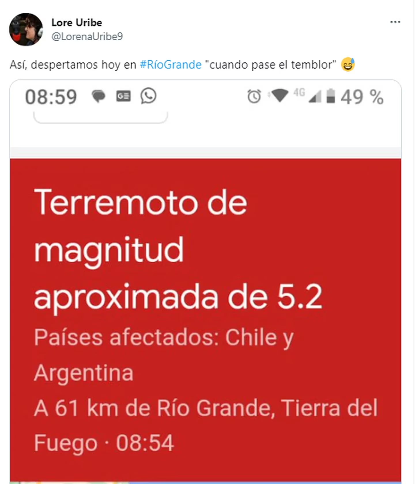 “Crujió todo y sé me movió el techo. Como buena riograndense enseguida culpé al viento. Pero no”, posteó en Twitter la usuaria María Fernanda Rossi. Otra internauta, agregó: “Tremendo el terremoto que se acaba de sentir en Río Grande”.