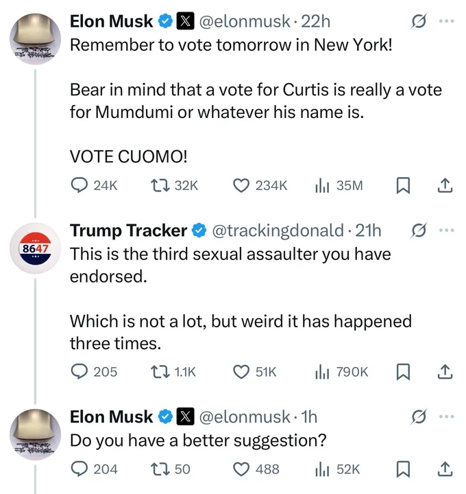 Musk publicó un mensaje pidiendo el voto por el candidato independiente Andrew Cuomo: «¡Recuerden votar mañana en Nueva York! ¡VOTEN POR CUOMO!». En el mismo posteo, el dueño de X advirtió: «Tengan en cuenta que un voto por Curtis (Sliwa) es realmente un voto por Mumdumi o como sea que se llame».