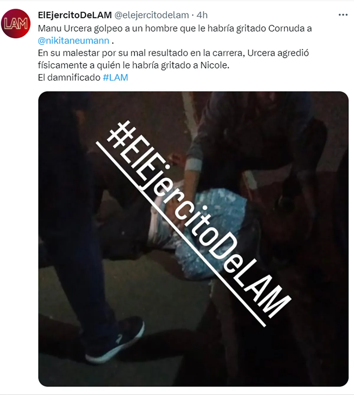 El novio de Nicole Neumann, Manu Urcera, fue protagonista de un escándalo en la quinta fecha del Turismo Carretera. El piloto golpeó a un espectador quien lo increpó en boxes y terminó en el hospital por las heridas. ElEjércitodeLAM publicó en redes la foto.