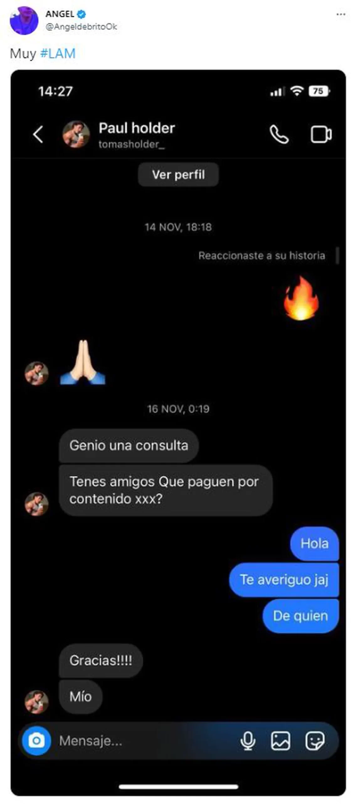“Genio, una consulta: ¿tenés amigos que paguen por contenido XXX?”, le preguntó Holder a uno de sus seguidores de Instagram. El joven le contestó que iba a averiguarlo, y quiso saber de quién era. “Mío”, respondió Holder y le agradeció por comprometerse a ver si a algún conocido le interesaba.