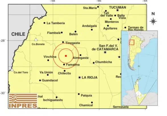 El sismo ocurrió con exactitud a las 13.04 en La Rioja, tuvo una magnitud de 5,9 grados y se produjo a una profundidad de 10 kilómetros, según el Instituto Nacional de Prevención Sísmica (Inpres). El epicentro fue a unos 37 kilómetros de Famatina. Confirman que no hubo heridos ni víctimas mortales, sí de algunos daños materiales. Sobre todo, quebradura en paredes de algunas viviendas y caída de mampostería.