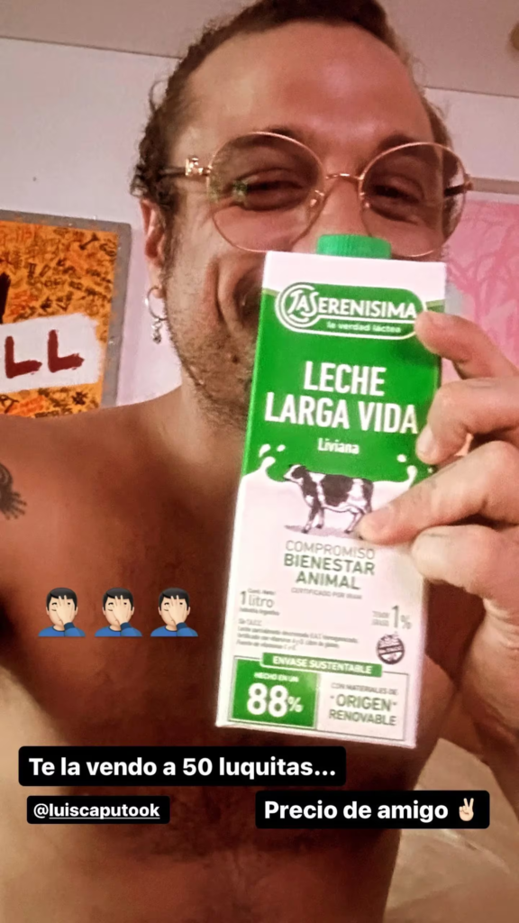 “Te la vendo a 50 luquitas, Luis Caputo. Precio de amigo”, escribió el exdelantero de Boca en su cuenta personal de Instagram, mostró una leche larga vida liviana con tres emojis del hombre con la mano en la frente y otro con señal de victoria.