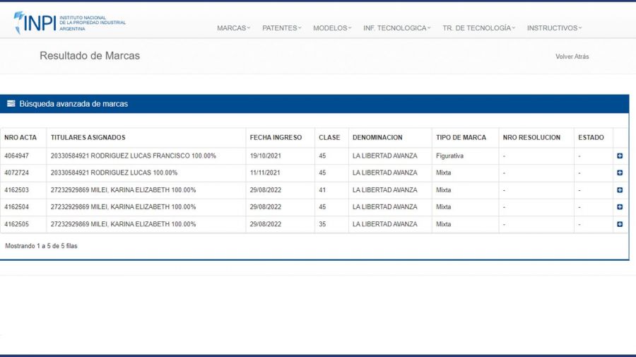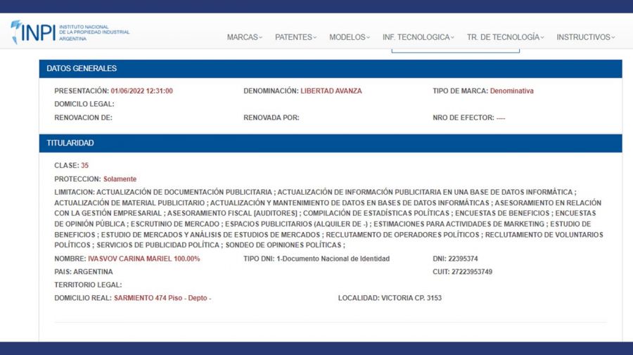 PERFIL consultó a la base de datos del Intituto Nacional de la Propiedad Industrial (INPI) y el nombre «La Libertad Avanza» aparece registrado como marca mixta a nombre de Karina Milei y Lucas Rodríguez, que también tiene la marca figurativa homónima.