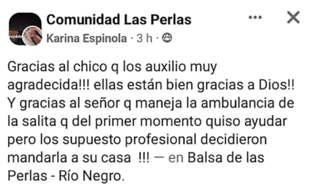 Además, contó que su hija y su nieta se encuentran en buen estado de salud. “Es impresionante lo que pasó, pobrecita, pero está bien, gracias a dios y gracias a vos porque yo creo que si no fuese por vos, no sé qué hubiese pasado”, expresó la mujer en un audio que compartió la radio.