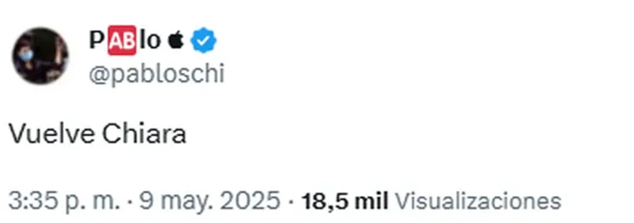 «Vuelve Chiara», sostuvo el tuitero este viernes, sin brindar mayores detalles, pero dejando a un gran número de fans con la total incertidumbre.
