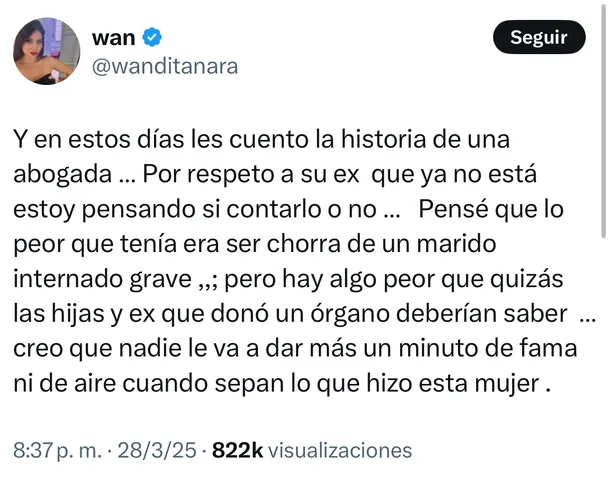 «Y en estos días les cuento la historia de una abogada… Por respeto a su ex que ya no está, estoy pensando si contarlo o no… Pensé que lo peor que tenía era ser chorra de un marido internado grave ,,; pero hay algo peor que quizás las hijas y ex que donó un órgano deberían saber… creo que nadie le va a dar más un minuto de fama ni de aire cuando sepan lo que hizo esta mujer», escribió Wanda en su cuenta de X haciendo referencia a Marcovecchio en calidad de viuda de Jorge Lanata.