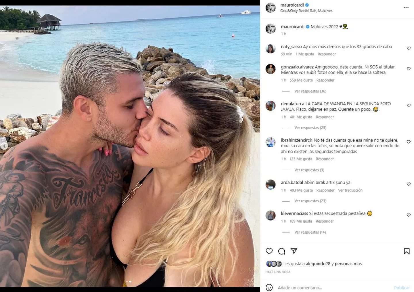 A pesar de que Wanda Nara se resiste a confirmar que se reconcilió e insiste en que está soltera, Mauro Icardi se empeña en demostrar que siguen juntos. Ahora el futbolista publicó dos fotos de su viaje a Maldivas y el gesto de la empresaria no pasó inadvertido entre los usuarios que comentaron: “No te quiere, date cuenta”.