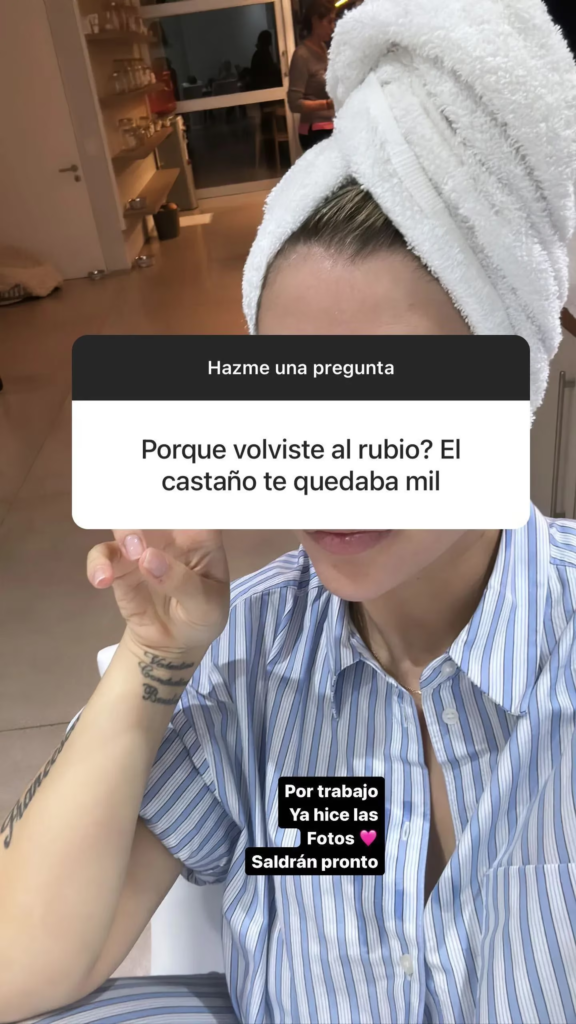 “¿Por qué volviste al rubio? ¡El castaño te quedaba mil!”, le preguntó una fan. Sin vueltas, la mediática explicó por qué regresó a su color clásico de pelo y adelantó que se viene un nuevo desafío en su carrera. “Fue por trabajo. Ya hice las fotos, saldrán pronto”, respondió.