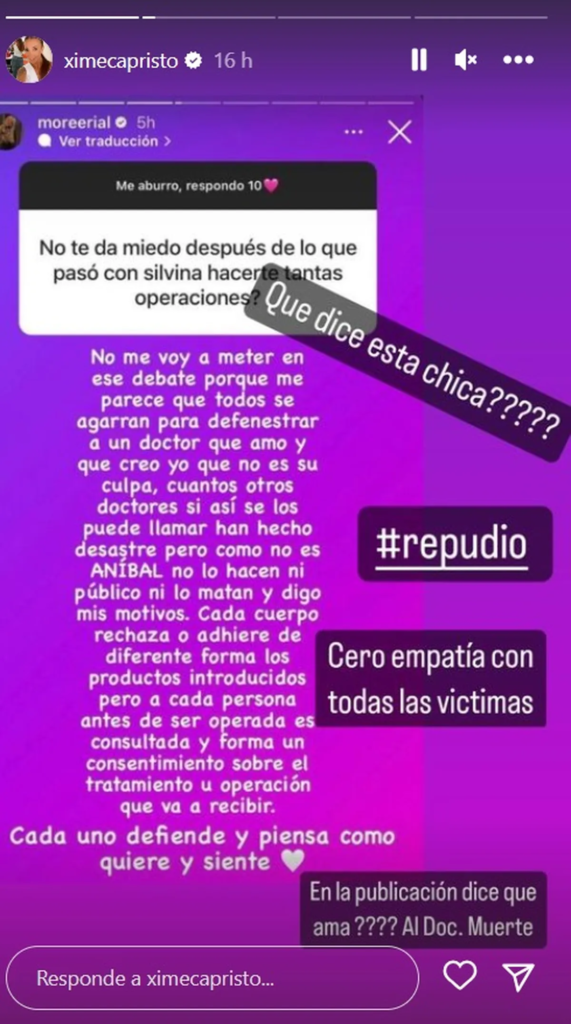 «Qué dice esta chica? #Repudio. Cero empatía con todas las víctimas», manifestó la pareja de Gustavo Conti desde sus historias en Instagram.
